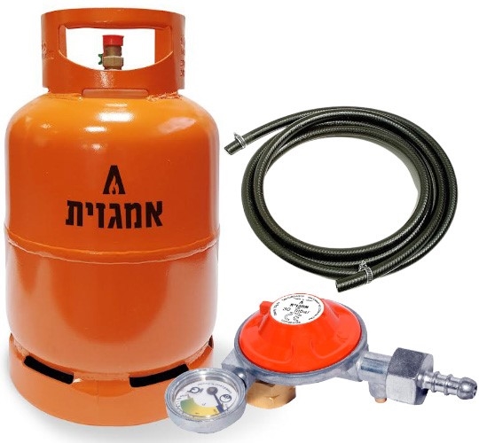 מיכל גז 5 ק"ג אמגזית מלא + ווסת בטיחותי וכולל שעון מד גז בחיבור M בהספק Mbar 30
