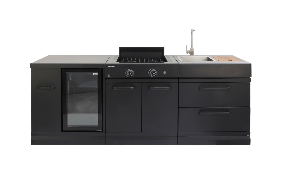 מטבח חוץ מודולרי הכולל :   יחידת כיריים כפולות +  יחידת כיור + יחידת עבודה ומקרר מותג  GRLLR .